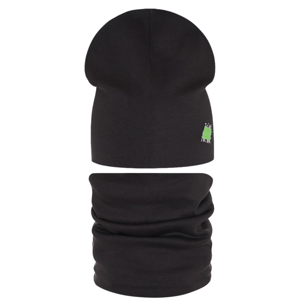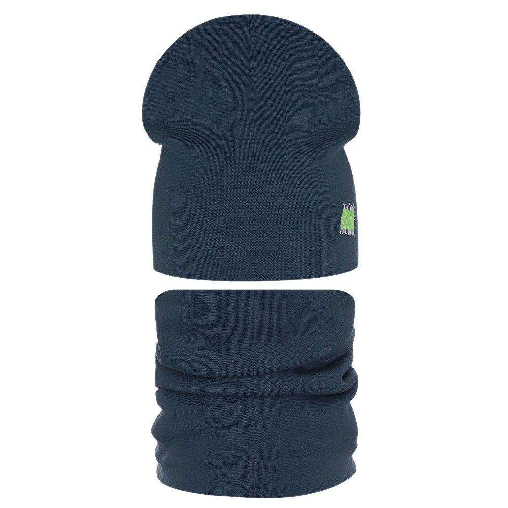 Стильный комплект из двухслойной шапки и снуда для мальчика. Изготовлен из трикотажного хлопкового полотна европейского качества с нашивкой. Мягкий, эластичный и приятный на ощупь - подарит тепло и невероятный комфорт в прохладную погоду.