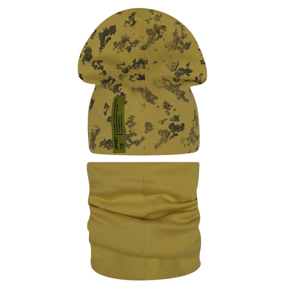 Стильная шапка и снуд для мальчика из мягкого хлопкового трикотажа с принтом, нанесенным краской высокой износостойкости, которая не трескается при длительном растяжении и не портится при стирке. Модель хорошо тянется и предполагает неплотную посадку по форме головы.