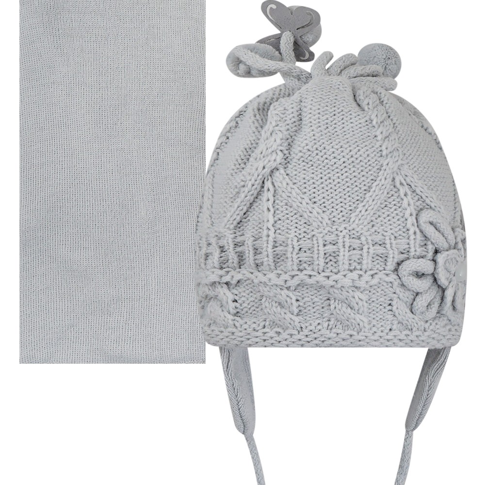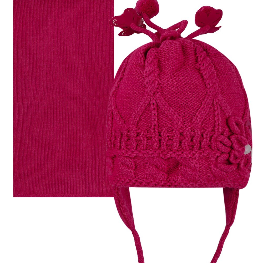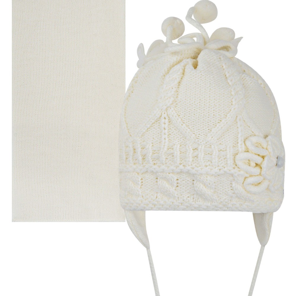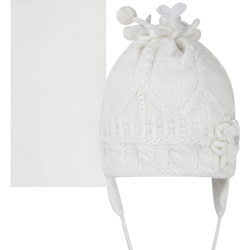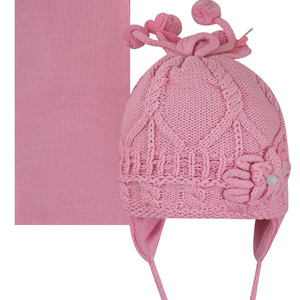 Комплект для девочки с помпонами, оформлен бусинами и декоративным цветком, на завязках.