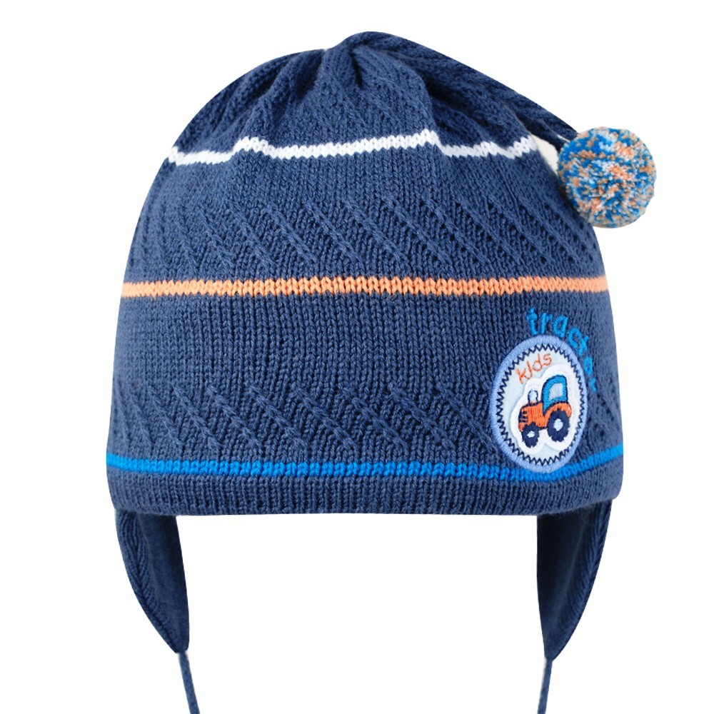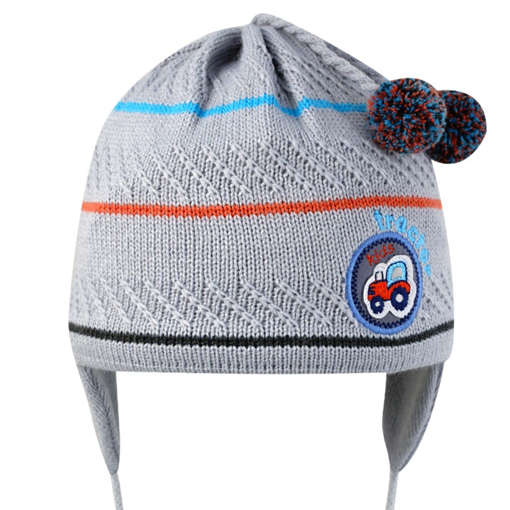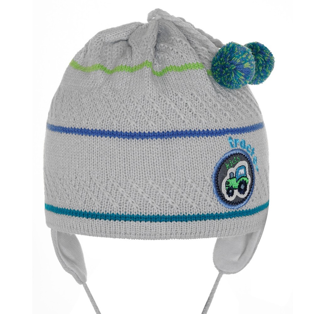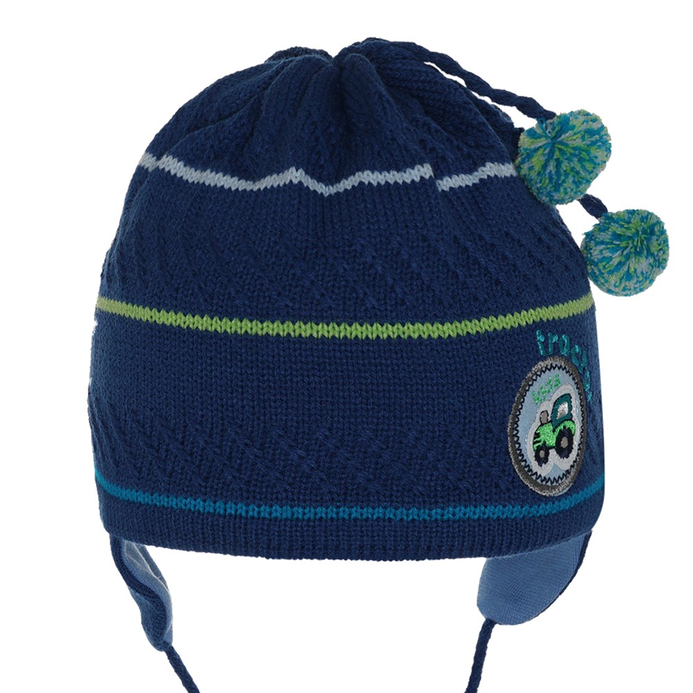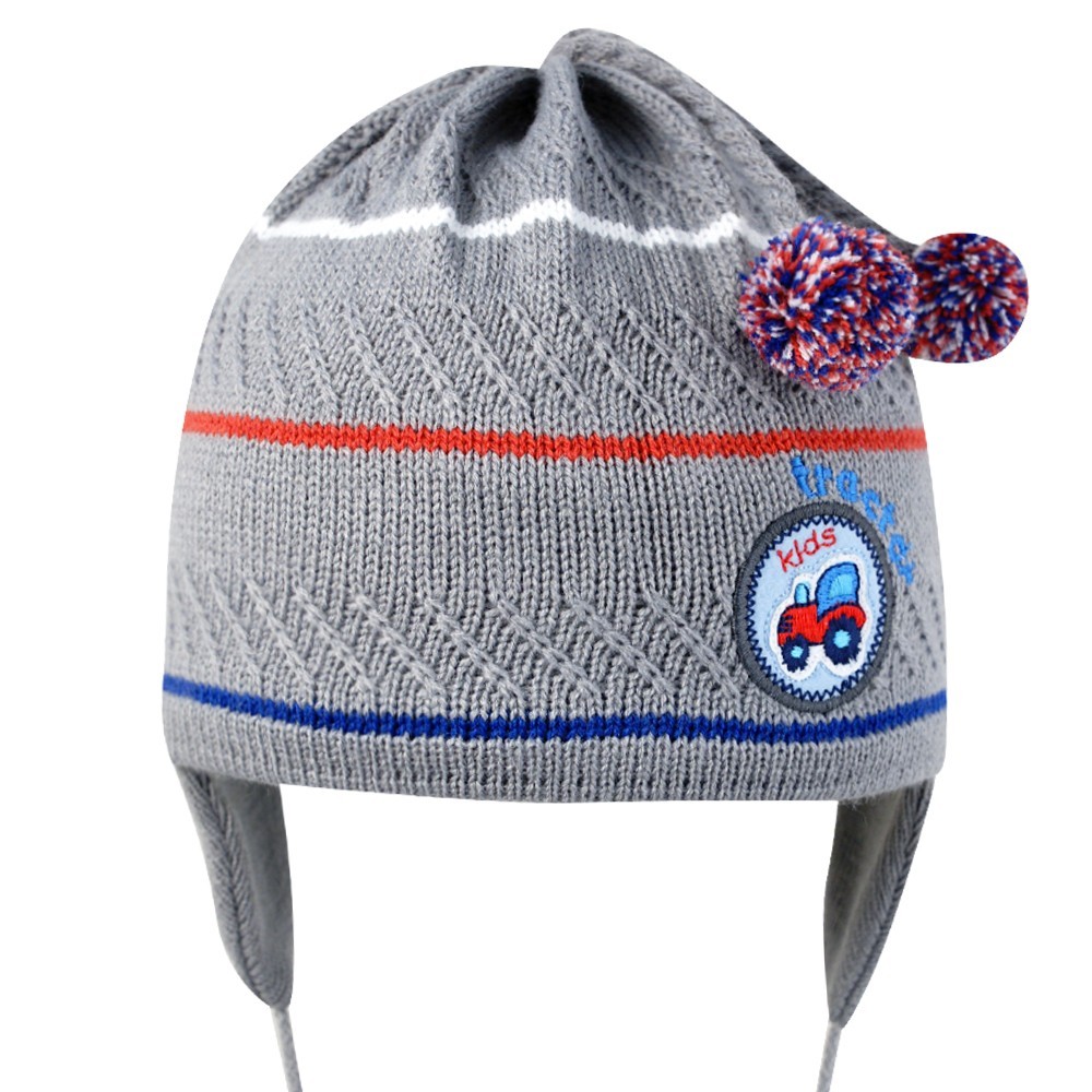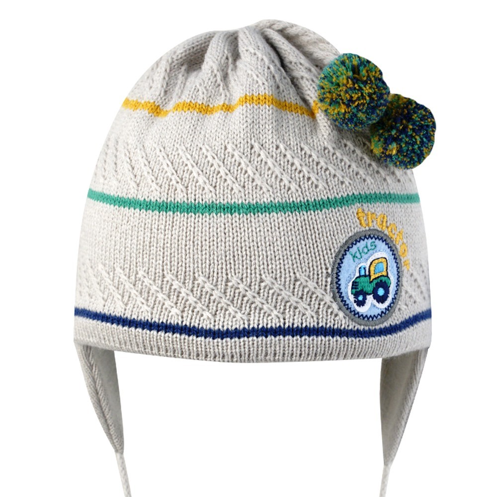 Шапка на мальчика с помпонами и нашивкой машинкой, на завязках.
