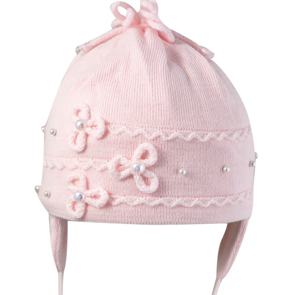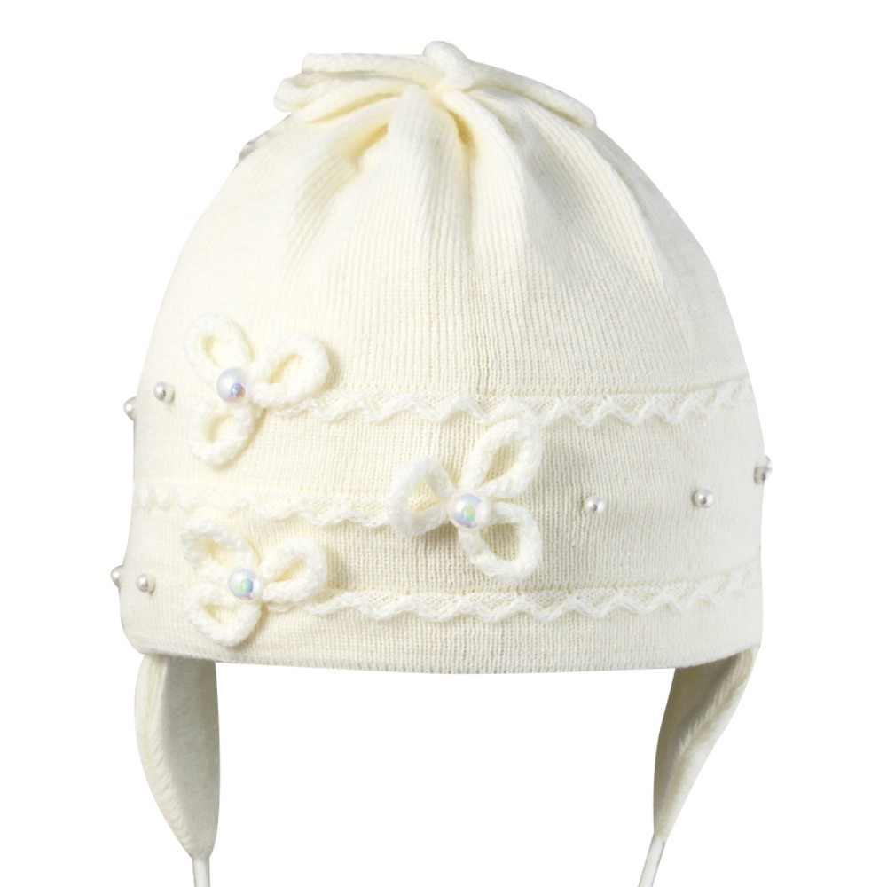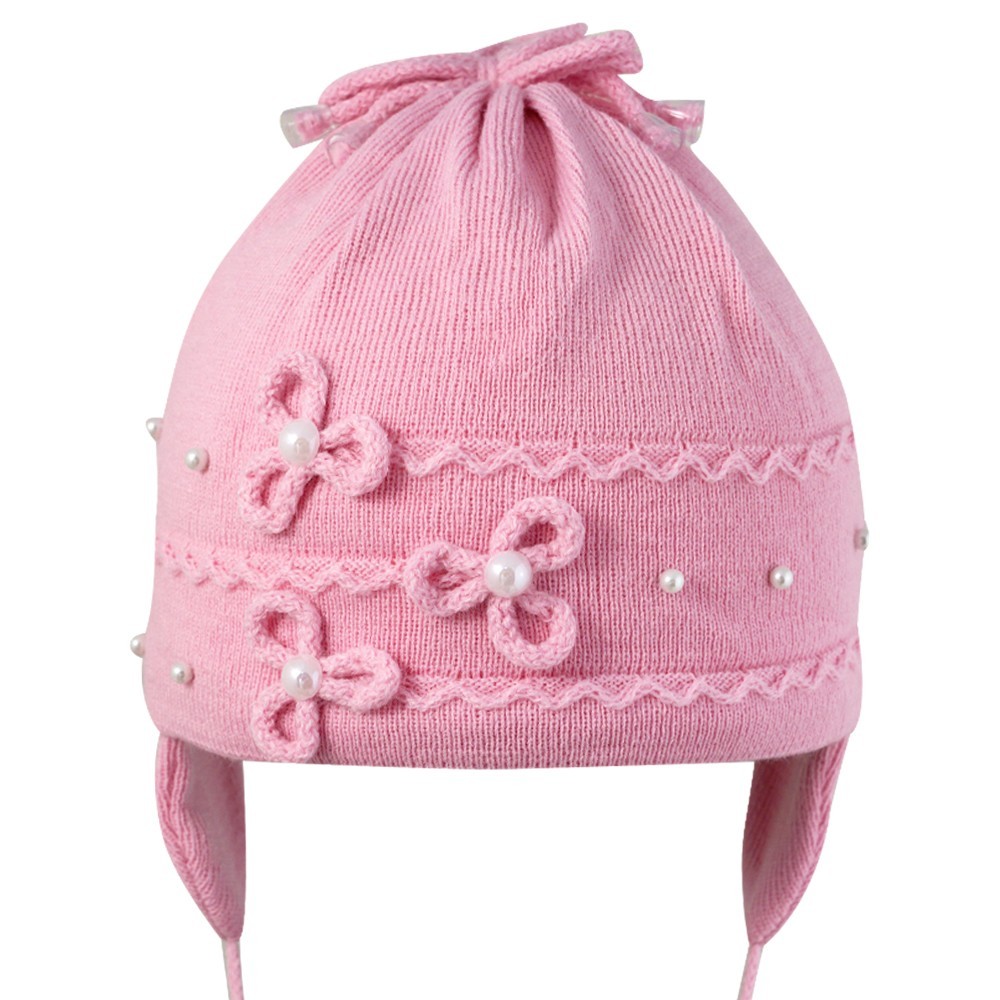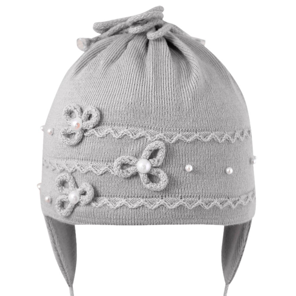 Шапка для девочки с бусинами и декоративными цветками, на завязках.