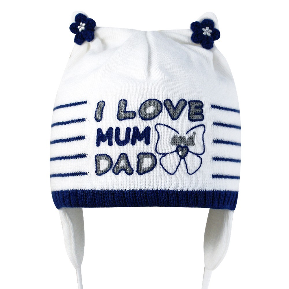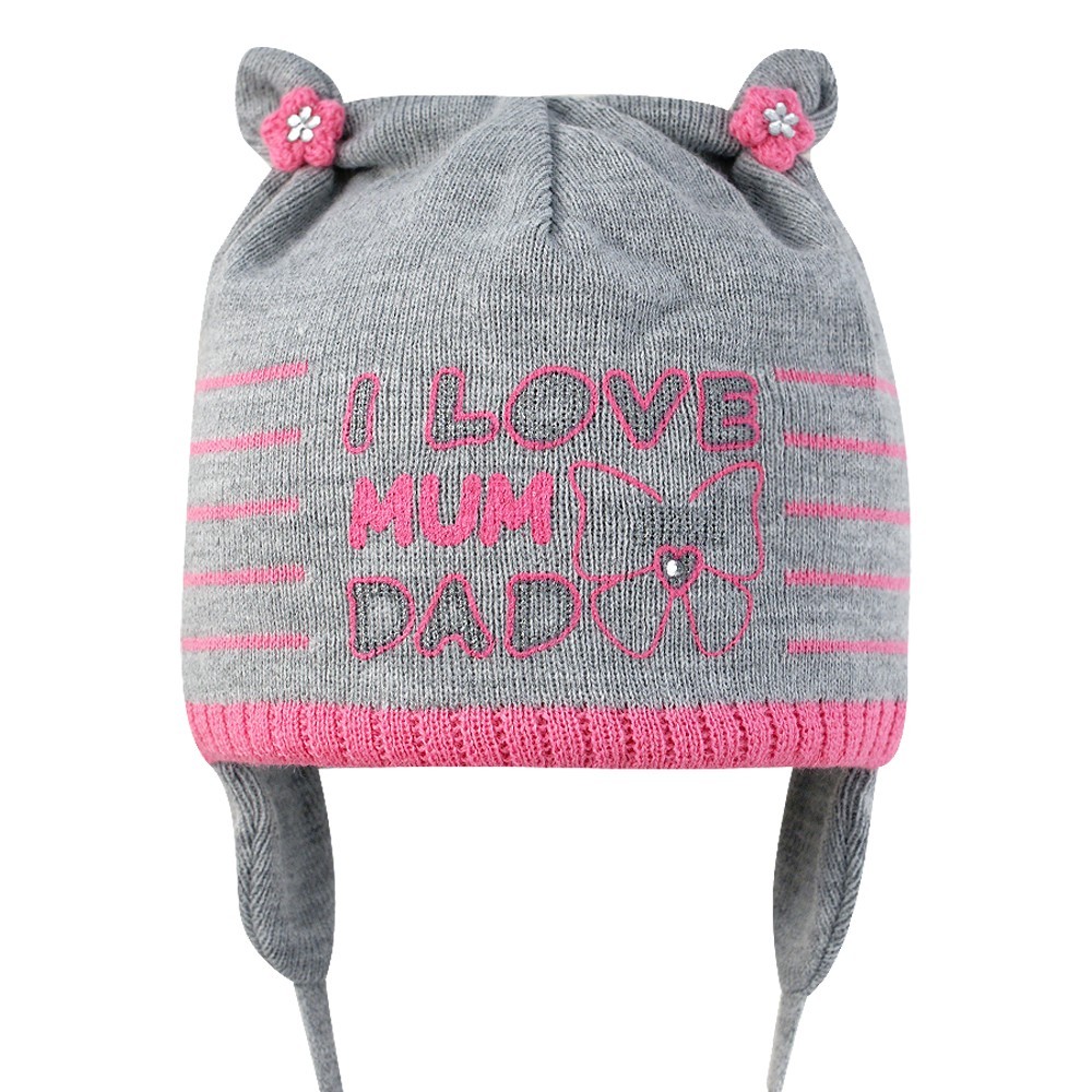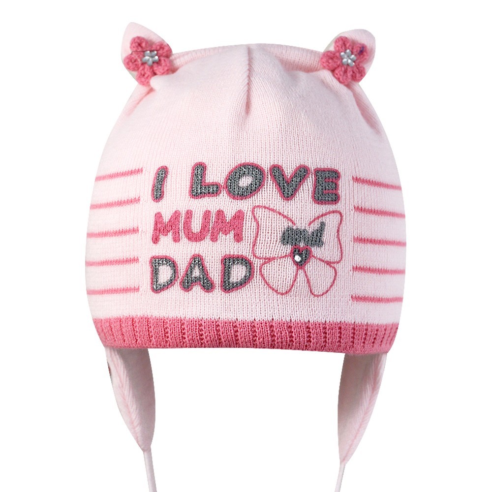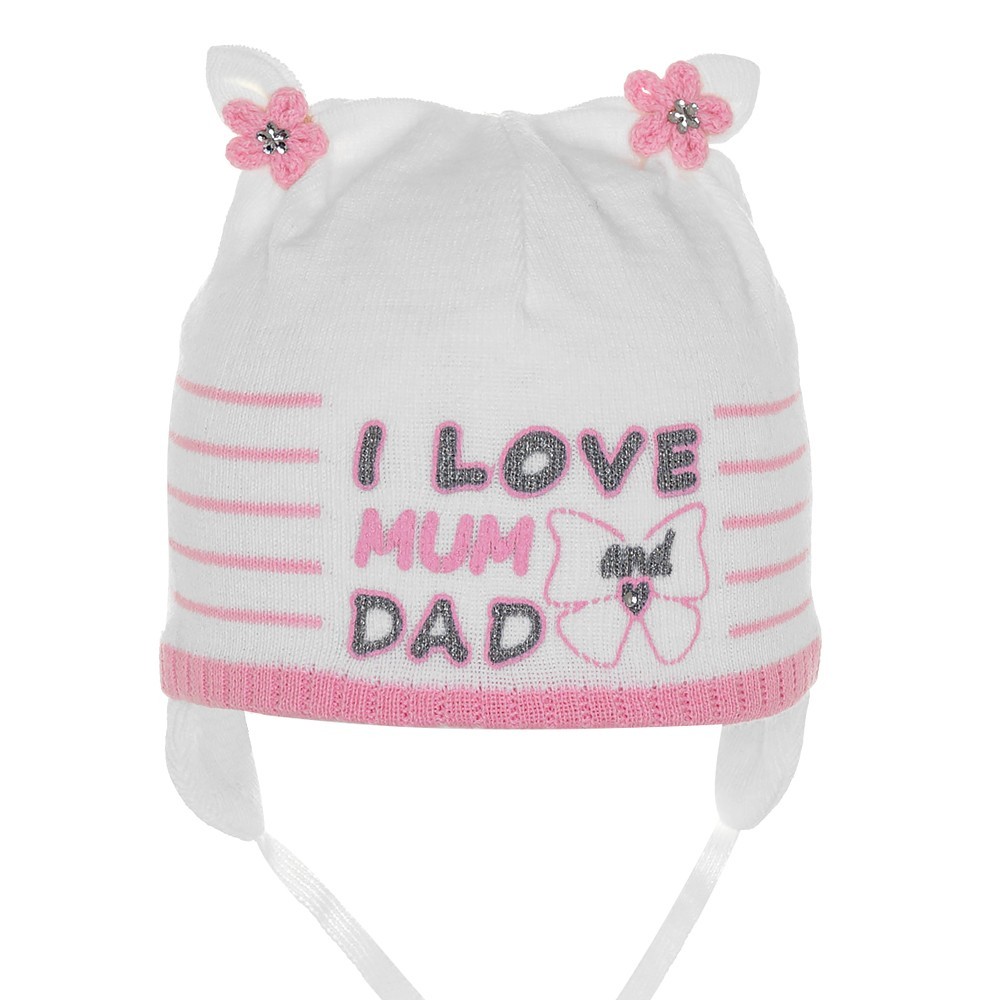 Шапка для девочки с декоративными цветочками на имитированных ушках и надписью, на завязках.