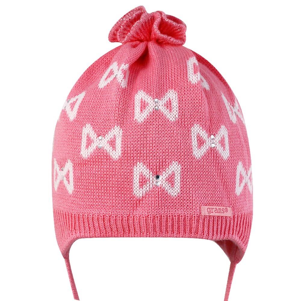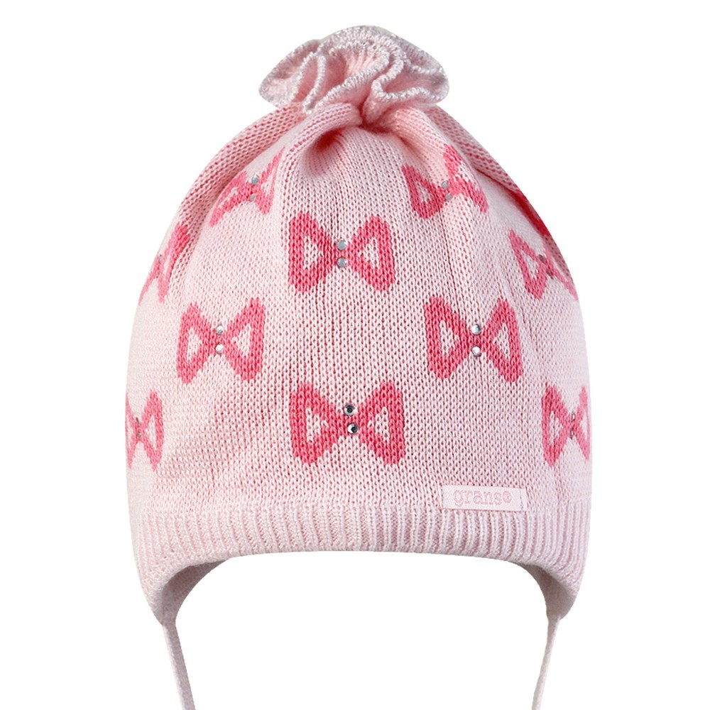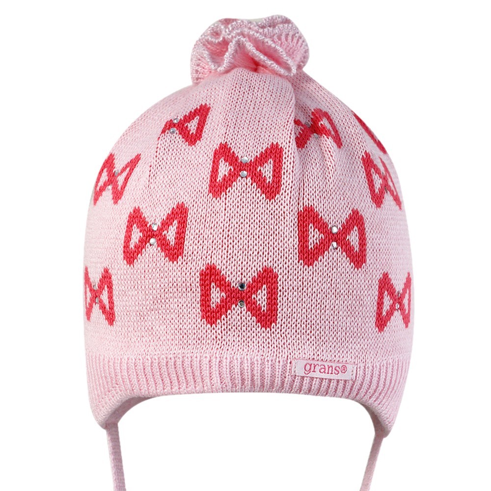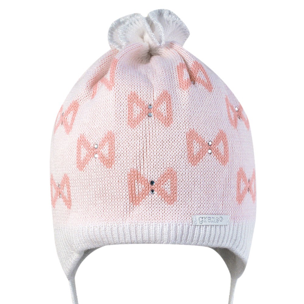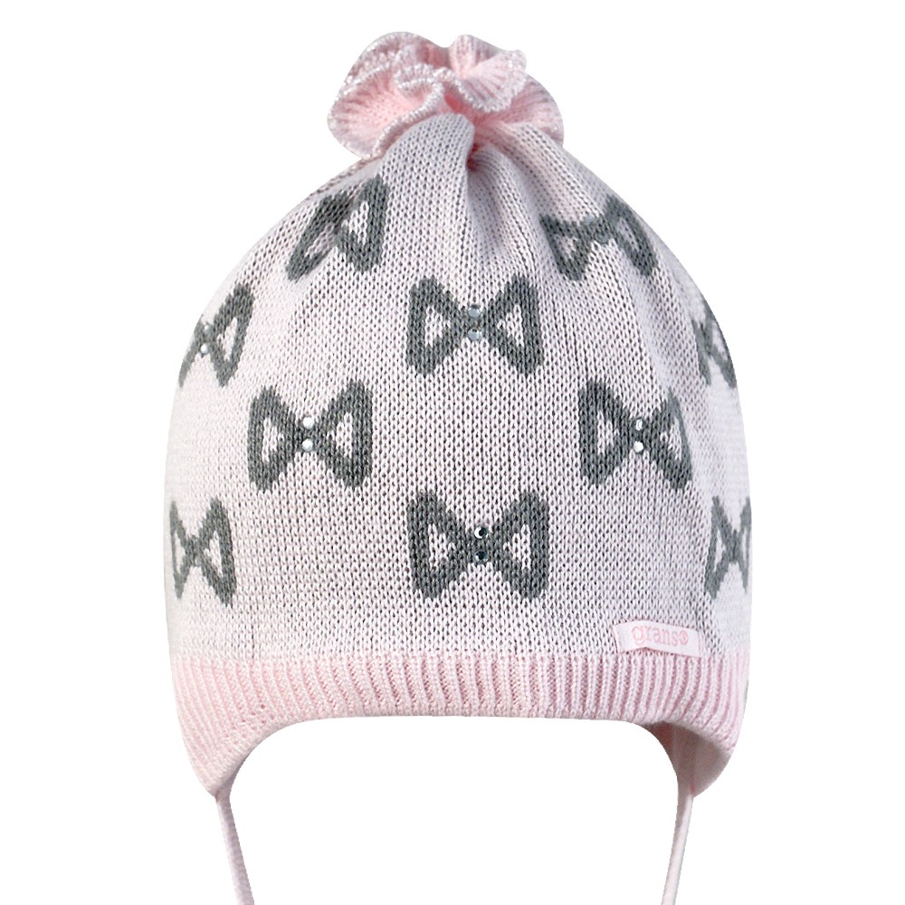 Шапка для девочки с жаккардовым рисунком "бантики", на завязках.