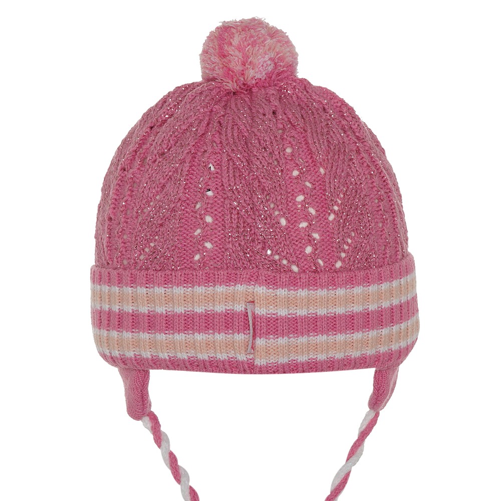 Шапка с люрексом для девочки оригинальной вязки,с отворотом в полоску, украшенной ниточным помпоном на макушке и нашивкой , на завязках.