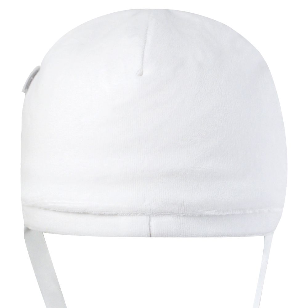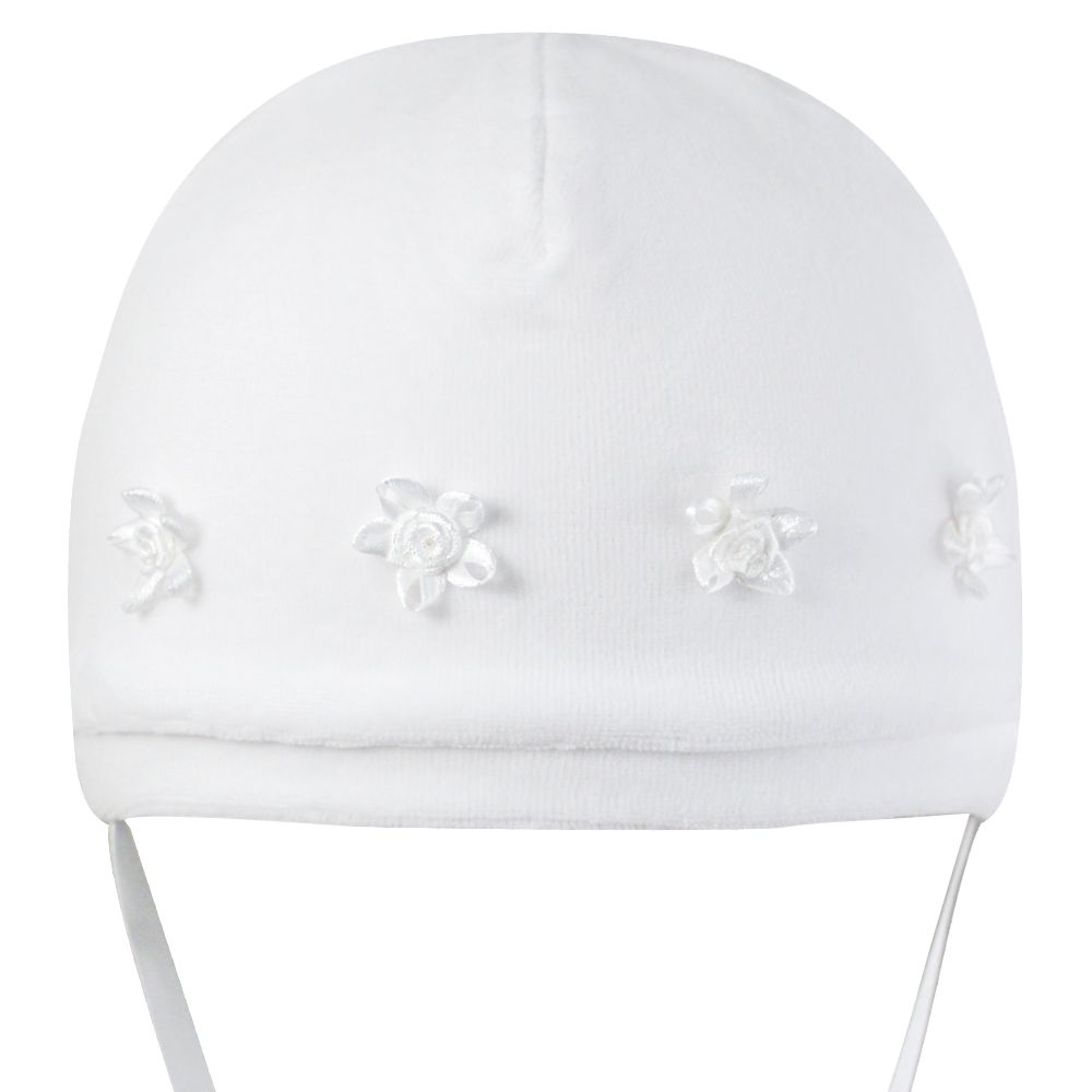Белая шапочка для крестин на девочку, с декоративными цветочками из атласной ленты, на завязках.