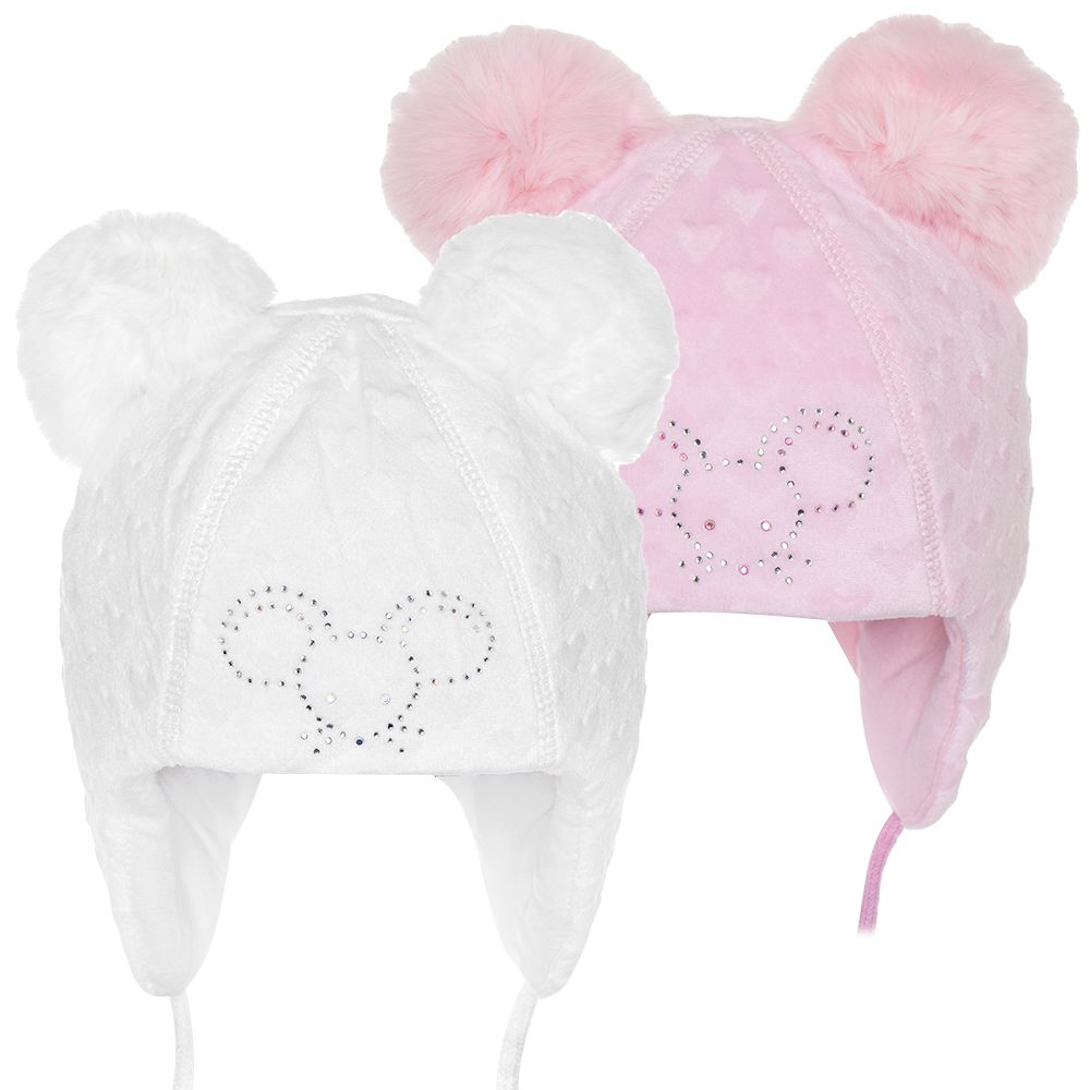 Шапка для девочки с 2 помпонами из искусственного меха на завязках и мышкой из страз.